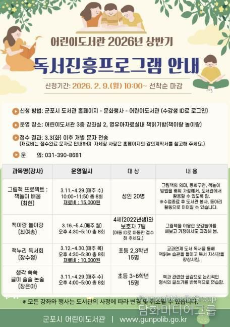 군포시 어린이도서관 관계자는 “이번 봄학기 독서진흥프로그램은 어린이들이 또래와 함께 독서 역량을 키울 수 있도록 기획했으며, 성인강좌를 통해 가정과 도서관이 함께하는 독서환경을 조성하고자 한다”며 “시민들의 많은 관심과 참여를 바란다”고 말했다.
