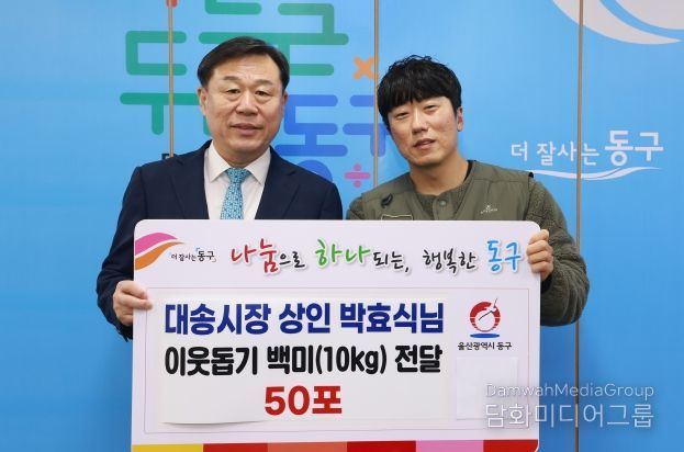 시민행정신문 강갑수 기자 | 울산 동구 대송시장에서 식품유통업체를 운영하고 있는 new캐슬장터 박효식 대표가 1월 28일 오전 11시 10분 동구청을 방문해 시가 200만원 상당의 쌀(10kg) 50포를 전달했다.