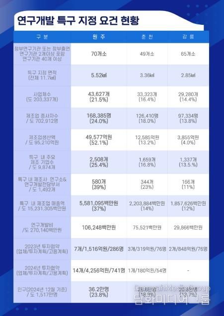 특구 지정 면적에서도 원주의 비중은 크다. 원주 지역 특구 면적은 5.52㎢로, 춘천·강릉을 포함한 전체 특구 면적 11.7㎢의 절반가량을 차지하고 있다.