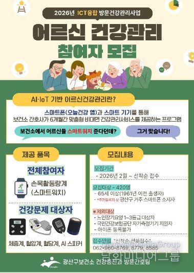 광산구 관계자는 “스마트 기술을 활용해 어르신이 건강한 생활 습관을 형성하고 만성질환을 관리할 수 있도록 돕겠다”라며 “어르신들이 자가건강관리 역량을 강화해 건강한 노후를 보낼 수 있도록 최선을 다하겠다”라고 전했다.
