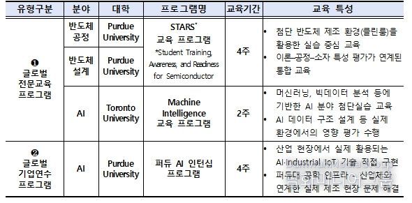 다음으로, ‘첨단분야 글로벌 교육과정 운영사업’은 국내외 대학이 공동으로 반도체, 인공지능(AI) 등 첨단분야와 관련된 해외 교육과정을 기획·운영하는 사업이다. 선발된 학생은 해외 대학에서 실습형 교육과정, 현지 기업 현장 방문, 한인 재직자 간담회 등의 국제 프로그램에 참여하게 된다. 올해는 대학이 추천한 우수 학생 중 120명을 최종 선발하여, 퍼듀대학교(미국), 토론토대학교(캐나다)와 연계해 다양한 교육 경험을 지원할 계획이다.