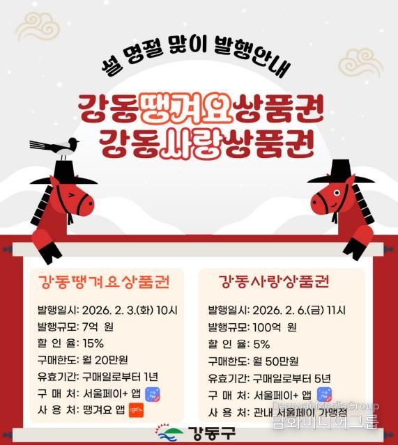 명절 이후에도 소비 회복 흐름이 이어질 수 있도록 강동땡겨요상품권은 3월과 4월에 각각 7억 원씩, 강동사랑상품권은 4월에 40억 원을 추가 발행할 계획이다. 두 상품권 모두 서울페이플러스 앱을 통해 구매할 수 있다.