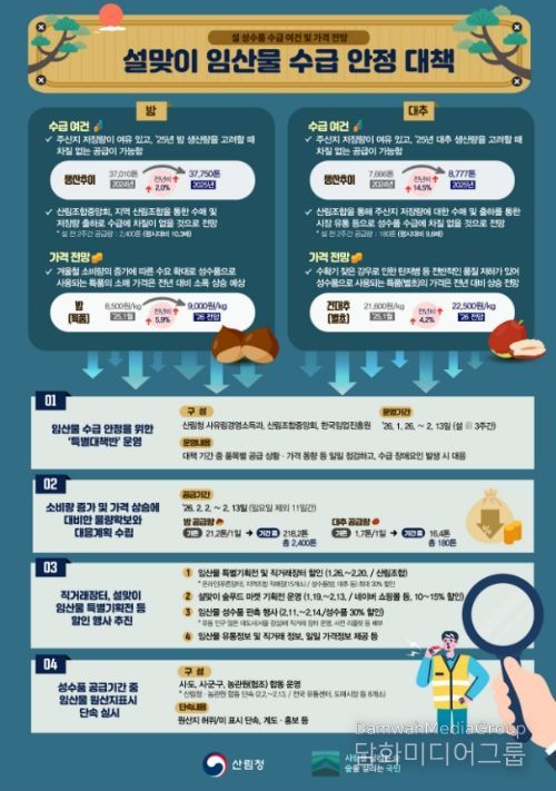 대책반은 물가안정과 수급 조절을 위해 임산물의 가격 동향 및 공급 상황을 매일 점검하고, 성수품 수요가 늘어나는 설 2주 전부터 밤과 대추를 평상시보다 10배 늘린 2,580톤(밤 2,400톤, 대추 180톤)을 공급해 성수품의 시장가격 안정을 유도할 계획이다.