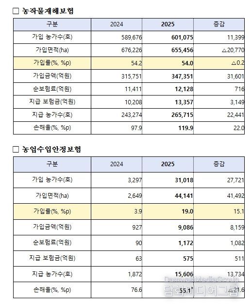2025년에는 가입과 보상 모두 역대 최고 실적을 기록했다. 총 76개 품목 700천ha에 대해 632천명이 농작물보험에 가입했으며, 가입률은 전년 대비 3.3%P 증가한 57.7%, 순보험료 총액은 1조 3,300억원이었다. 가입률이 높은 품목은 사과 105.8%, 월동무 94.0%, 배 86.9%, 가을무 71.4%, 콩 67.8%, 벼 65.1% 등이었다.