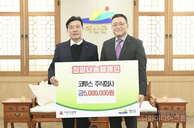 시민행정신문 강갑수 기자 | 예산군은 예당호 모노레일 운영회사인 주식회사 코투스가 어려운 이웃을 돕기 위한 ‘희망 2026 나눔캠페인’에 동참해 성금 500만 원을 기탁했다고 2일 밝혔다.