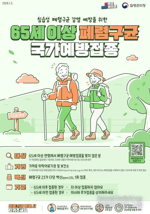 접종 대상은 폐렴구균 예방접종을 한 번도 맞지 않은 65세 이상(1961.12.31.이전 출생자)이며, 폐렴구균 23가 다당백신을 1회 무료로 접종받을 수 있다.