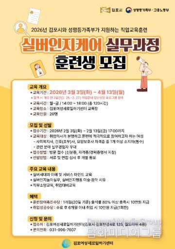 시민행정신문 이세훈 기자 | 김포여성새로일하기센터가 초고령사회 진입에 따른 지역 내 노인 돌봄 서비스의 질적 향상을 도모하고, 경력보유여성의 성공적인 재취업을 지원하기 위해 ‘실버인지케어 실무과정’ 교육생을 모집한다.