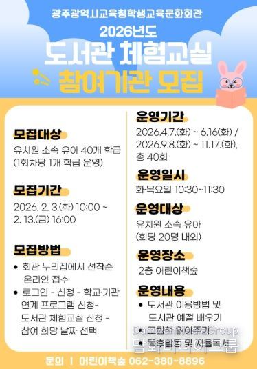 시민행정신문 기자 | 광주시교육청학생교육문화회관은 오는 3일부터 도서관 현장 체험 프로그램 ‘도서관 체험교실’에 참가할 유치원을 모집한다.