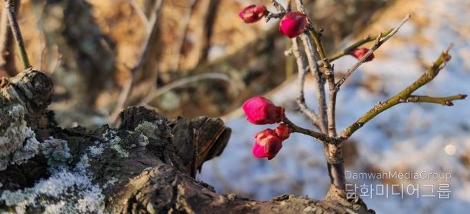 시민행정신문 강갑수 기자 | 입춘을 이틀 앞둔 2일, 밤사이 눈이 내린 가운데 광양시청 앞 미관광장 매화동산에서 홍매가 개화했다.