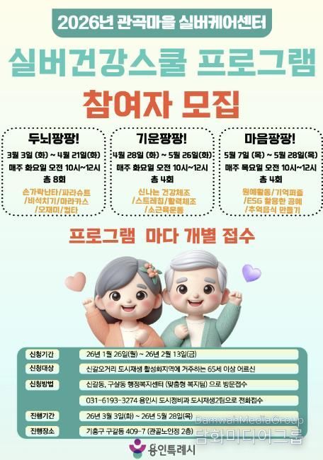 시민행정신문 강갑수 기자 | 용인특례시는 ‘관곡마을 실버케어센터 실버건강 프로그램’ 참가자를 13일까지 모집한다.