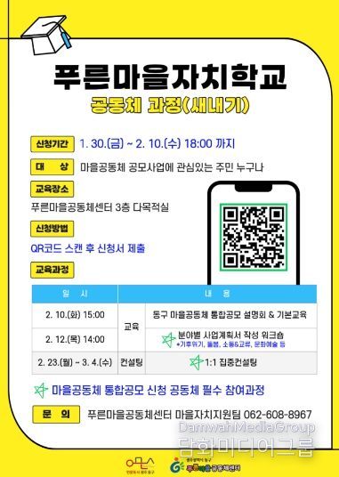 ‘푸른마을자치학교 공동체 과정(새내기)’ 참여를 희망하는 주민은 동구 푸른마을공동체센터 마을자치지원팀으로 문의하면 된다.