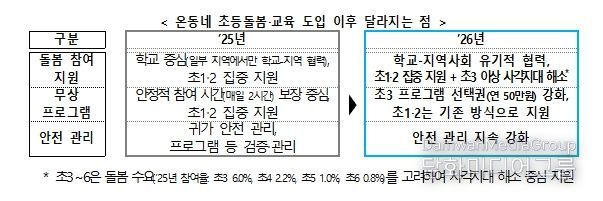 교육부는 2024년부터 늘봄학교 정책을 통해 초등학교 1‧2학년의 돌봄 공백 해소를 집중적으로 지원해 왔다. 2026년부터는 기존의 늘봄학교를 ‘온동네 초등돌봄‧교육’ 정책으로 발전시켜, ①학교와 지역사회가 함께 희망하는 초등학생에게 사각지대 없는 돌봄을 제공하고, ②돌봄보다 교육에 대한 수요가 큰 초등학교 3학년 이상 학생*의 방과후 교육 참여를 중점 지원한다.