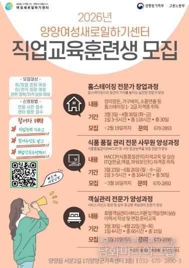 시민행정신문 강갑수 기자 | 양양여성새로일하기센터는 취·창업을 희망하는 여성을 대상으로 2026년도 직업교육훈련생 50명을 모집한다.