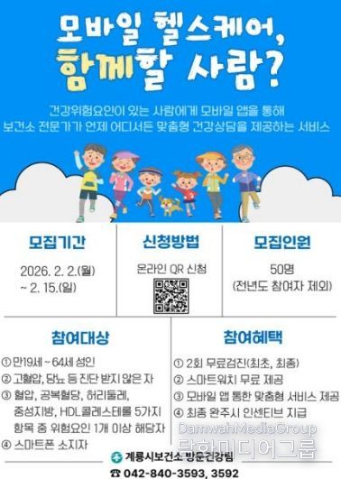 시민행정신문 기자 | 충남 계룡시는 시민의 자발적인 건강관리 지원을 위해 오는 15일까지 ‘모바일 헬스케어’ 사업 참여자 50명을 모집한다고 밝혔다.