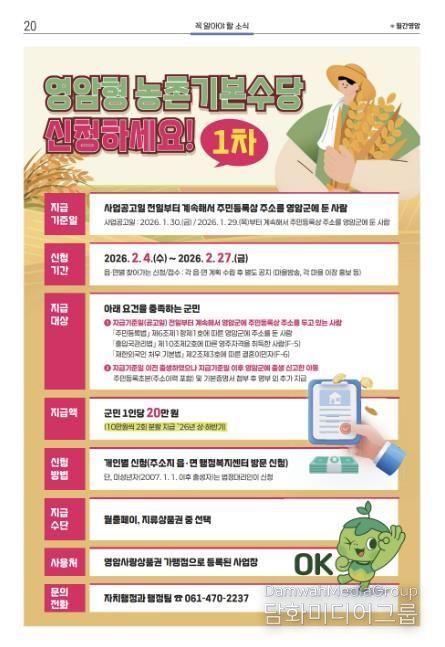 시민행정신문 이세훈 기자 | 영암군이 이달 4~27일 군민의 지속가능한 삶을 지원하고 지역경제에 활력을 불어넣는 ‘영암형 농촌기본수당’을 지급한다.