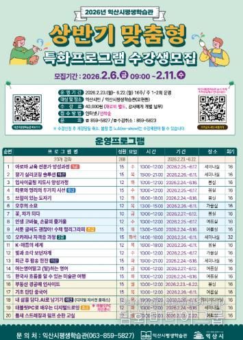익산시는 오는 6일부터 익산시평생학습관에서 '2026년 상반기 맞춤형 특화프로그램' 수강생을 선착순으로 모집한다고 3일 밝혔다.