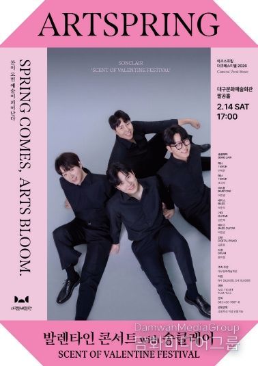 시민행정신문 강갑수 기자 | 대구문화예술진흥원 대구문화예술회관은 오는 2월 14일 오후 5시, 팔공홀에서 지역 성악가로 구성된 남성 4인조 크로스오버 보컬 그룹 송클레어(SONCLAIR)와 함께하는 ‘발렌타인 콘서트 with 송클레어 – Scent of Valentine Festival’을 개최한다.