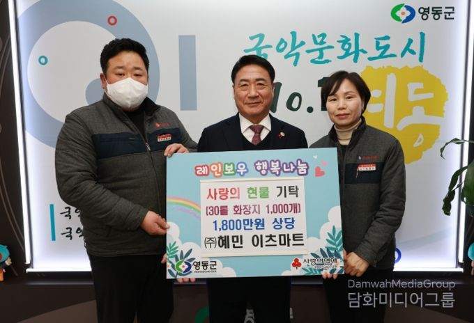 시민행정신문 강갑수 기자 | ㈜혜민 이츠마트(대표 정진흥)는 4일 영동군청을 방문해 지역 내 어려운 이웃을 돕기 위한 현물 기탁 30롤 화장지 1,000개(1,800만 원 상당)를 기탁했다.