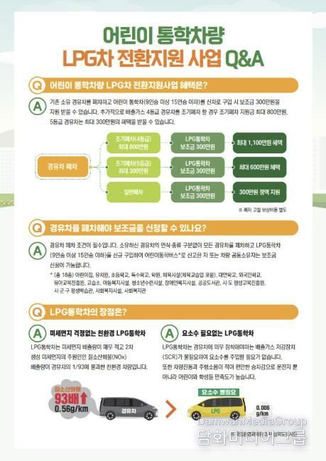 이번 사업은 기존에 운행하던 경유차를 폐차하고 LPG 어린이 통학차량을 신차로 구매하여 어린이 통학버스로 신고하는 차량 소유자에게 대당 300만 원의 보조금을 정액 지원하는 사업이다.