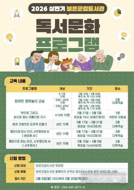 시민행정신문 강갑수 기자 | 충북 보은군립도서관은 군민에게 다양한 평생학습 기회를 제공하기 위해 ‘2026년 상반기 독서문화 프로그램’ 수강생을 모집한다고 4일 밝혔다.