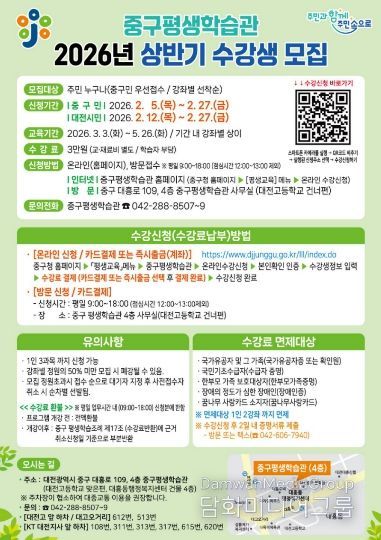 시민행정신문 강갑수 기자 | 대전 중구는 2월 5일부터 2026년 상반기 중구 평생 학습관 프로그램 수강생을 선착순 모집한다고 밝혔다.