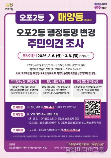 시민행정신문 강갑수 기자 | 광주시 오포2동은 지역 정체성을 반영한 행정동 명칭 변경을 위해 2월 6일부터 3월 8일까지 오포2동 전 세대를 대상으로 주민 의견 조사를 실시한다고 4일 밝혔다.