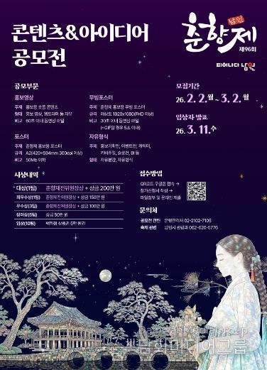 이번 공모전은 오는 2월 2일부터 3월 2일까지 한 달간 진행되며, 수상자에게는 총 1,000만 원 규모의 상금과 함께 남원춘향제전위원장상이 수여된다.