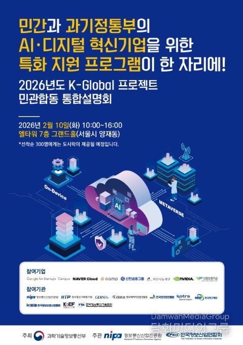 시민행정신문 이존영 기자 | 과학기술정보통신부는 인공지능·디지털 혁신기업의 성장을 지원하기 위한 과기정통부 지원사업들을 한자리에서 설명하는 '한국형 국제 사업(K-글로벌 프로젝트) 민·관 합동 통합설명회'를 2월 10일 오전 10시부터 서울 양재 엘타워에서 개최한다.