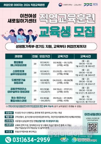 시민행정신문 이세훈 기자 | 이천여성새로일하기센터는 경력 단절 여성의 직업능력 개발과 취·창업 연계를 위해 2026년 직업교육훈련 교육생을 모집한다.