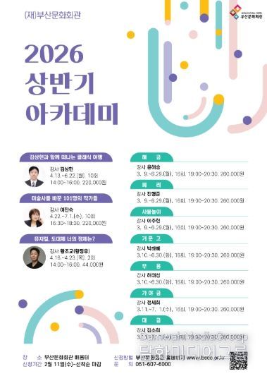 2026년 상반기 아카데미 강좌 수강 신청은 2월 11일 오후 2시부터 가능하며 강의 커리큘럼 및 강사 프로필 등 자세한 내용은 (재)부산문화회관 홈페이지 또는 전화를 통해 확인할 수 있다.