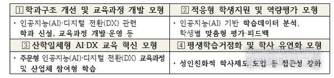 각 참여 대학은 지역 산업과 대학별 강점을 결합한 ‘인공지능(AI)·디지털 전환(DX) 특화 모형’을 구축한다. 대학별로 ▲학과구조 개선, ▲데이터 기반 학생 지원, ▲산학협력 교육, ▲학사제도 유연화 등 필요한 모형을 자유롭게 선택할 수 있다. 또한, 경진대회·공모전 개최로 우수 사례를 발굴·공유하면서, 전문대학 전반의 인공지능(AI)·디지털 전환(DX)을 이끌어갈 계획이다.