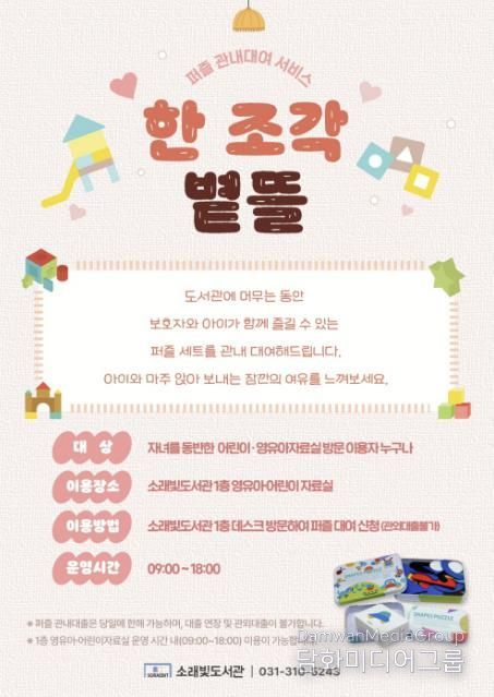 김혜순 소래빛도서관장은 “‘한 조각 볕뜰’은 아이들이 한자리에 머물며 차분히 몰입할 수 있는 시간을 제공하고자 기획한 서비스”라며, “부모와 아이가 함께 퍼즐을 맞추며 도서관에서의 경험이 더 깊어지길 기대한다”라고 말했다.