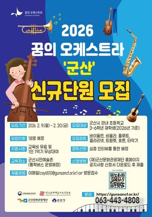 시민행정신문 강갑수 기자 | (재)군산문화관광재단이 ‘2026 꿈의 오케스트라 군산’과 함께 할 신규단원을 오는 20일까지 공개 모집한다.