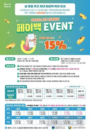 시민행정신문 강갑수 기자 | 광주광역시 서구가 설 명절 소비가 집중되는 시기를 맞아 ‘온누리상품권 페이백(환급) 행사’를 대폭 확대 운영한다.