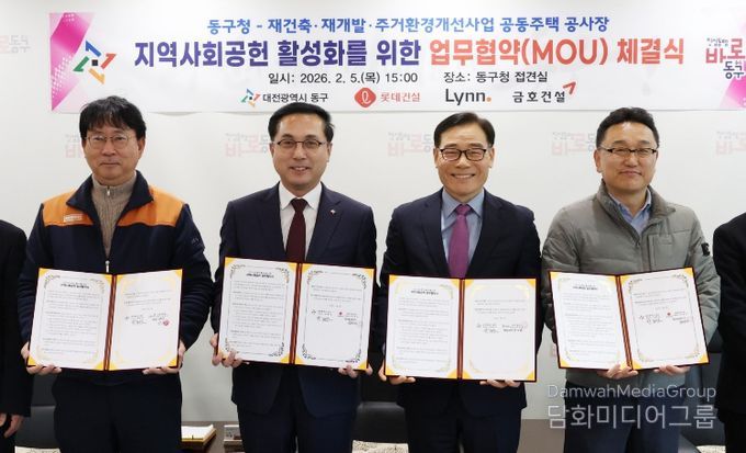 시민행정신문 강갑수 기자 | 대전 동구는 5일 관내 대규모 공동주택 공사 현장의 시공사와 ‘지역사회 공헌 활성화 업무협약’을 체결하고, 지역 안전관리 강화와 상생 협력을 위한 협력 체계를 구축했다고 밝혔다.
