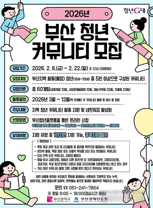 시민행정신문 강갑수 기자 | 부산시는 오늘(6일)부터 2월 22일까지 '2026년 청년 커뮤니티 활동 지원 사업' 참여팀을 모집한다고 밝혔다.