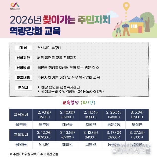 시민행정신문 강갑수 기자 | 충남 서산시는 2월 9일부터 3월 27일까지 관내 10개 읍면동을 대상으로 ‘2026년 찾아가는 주민자치 역량 강화교육’을 운영한다고 밝혔다.