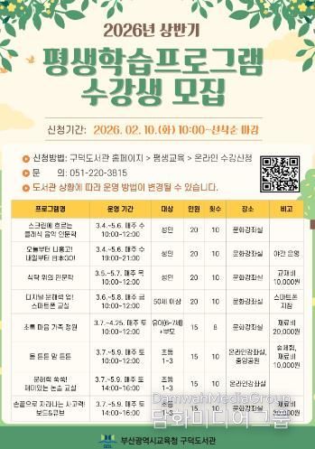 최인혜 구덕도서관장은 “이번 프로그램을 통해 지역 주민들이 배움의 즐거움을 경험하고 평생학습 역량을 키우길 바란다”며 “앞으로도 다양한 교육을 운영해 지역사회 평생교육을 활성화 하겠다”고 말했다.