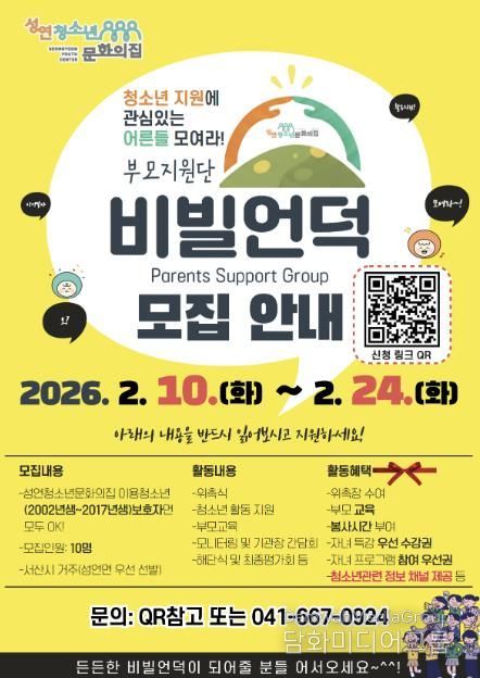 시민행정신문 강갑수 기자 | 성연청소년문화의집은 2026년 한 해 동안 지역 청소년의 건강한 성장과 안정적인 발달을 지원하기 위해, 청소년 보호자를 대상으로 부모지원단 ‘비빌언덕’ 참여자를 2월 10일부터 2월 24일까지 모집한다고 밝혔다.