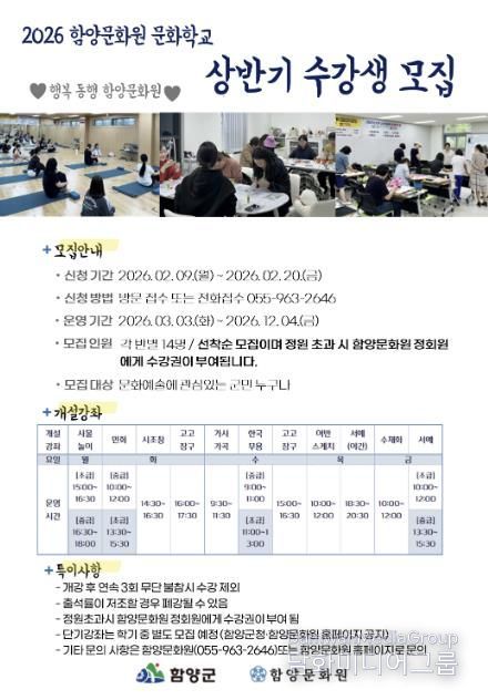 함양문화원 관계자는 “군민 누구나 배움을 통해 일상에 활력을 얻고 문화를 가까이에서 누릴 수 있도록 준비했다”며 “많은 관심과 참여를 바란다”고 전했다.