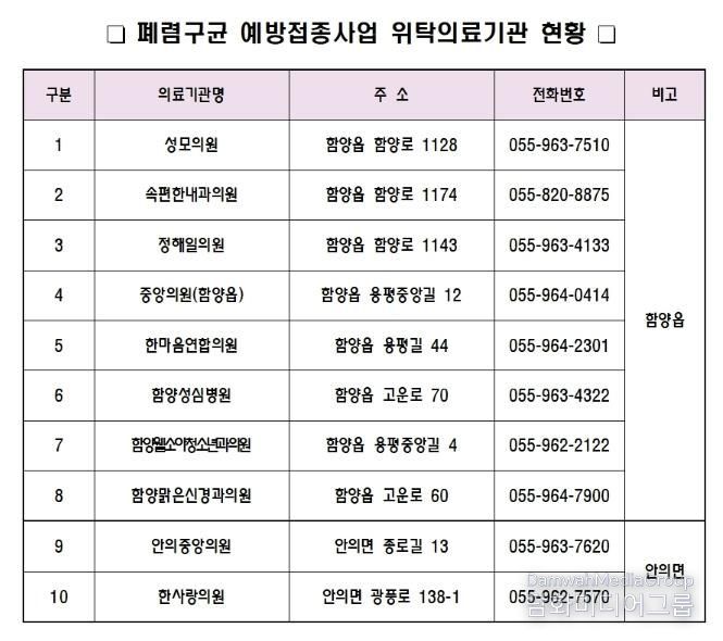 시민행정신문 기자 | 함양군은 65세 이상 어르신(올해 기준 1961년 12월 31일 이전 출생자)을 대상으로 폐렴구균 무료 예방접종을 연중 실시하고 있다고 밝혔다.