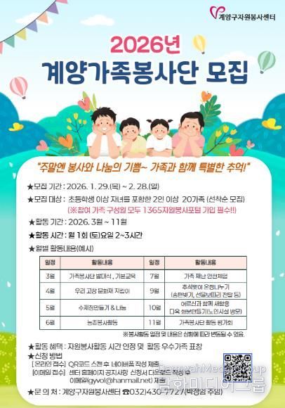 시민행정신문 강갑수 기자 | 인천광역시 계양구 자원봉사센터는 가족 단위 자원봉사 문화 확산을 위해 2026 마음 잇는 ‘계양 가족봉사단’에 참여할 20가족을 오는 3월 2일까지 선착순 모집한다고 밝혔다.