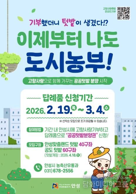 시민행정신문 강갑수 기자 | 안성시는 오는 2월 19일부터 고향사랑기부제를 통해 도시농업을 체험하는 ‘도시농부’를 모집한다고 밝혔다.