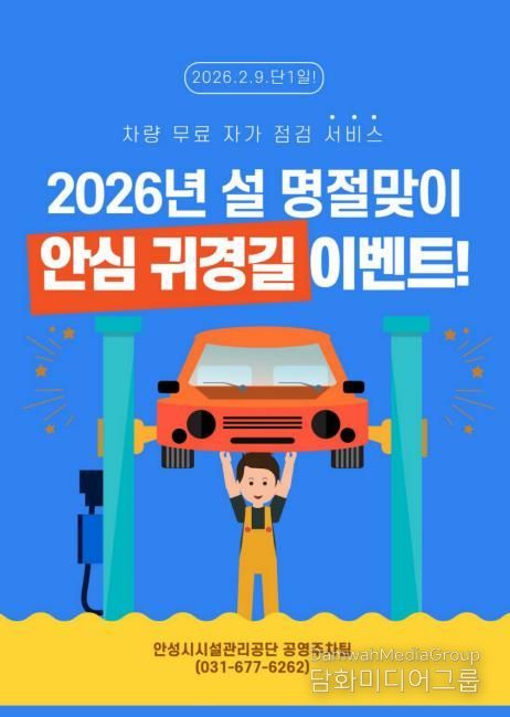시민행정신문 강갑수 기자 | 안성시시설관리공단은 오는 2월 9일 오전 10시부터 아양지구 제2공영주차장(경기도 안성시 옥산동546)에서 2026년 설 명절을 맞이하여 공영주차장 이용객과 지역 주민을 대상으로, 차량 무료 자가 점검 서비스 ‘안심 귀성길’캠페인을 추진한다고 밝혔다.