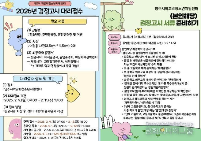 시민행정신문 강갑수 기자 | 양주시학교밖청소년지원센터에서는 학교 밖 청소년들을 위해 2026년 제1회 초중고 졸업 학력 검정고시 응시 원서 접수 대행을 지원한다.