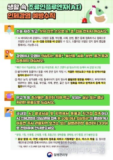 인체감염 예방을 위해서는 ▲손을 자주 씻고, 씻지 않은 손으로 눈·코·입을 만지지 않기 ▲감염 또는 오염이 의심되는 동물과 부산물, 사체, 분변, 오염된 물건과 접촉하지 않기 ▲닭고기 등 축산물은 충분히 익혀 섭취하고 우유는 살균·멸균 처리된 제품을 마시기 등 기본적인 예방수칙을 철저히 지켜야 한다.