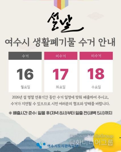 송병구 이사장은 “설 명절을 맞아 여수를 찾는 귀성객과 시민 모두가 깨끗하고 안전한 환경에서 명절을 보낼 수 있도록 현장 관리에 만전을 기하겠다”며, “시민 여러분께서도 수거 일정과 배출 시간을 준수해 주시길 당부드린다”고 말했다.
