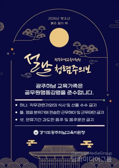 시민행정신문 기자 | 경기도광주하남교육지원청은 2월 9일, 2026년 병오년 설명절을 맞아 관내 교직원들이 청렴한 마음가짐으로 새해를 시작할 수 있도록‘교육장 청렴서한문’과‘청렴주의보’를 각급 학교에 전달했다.