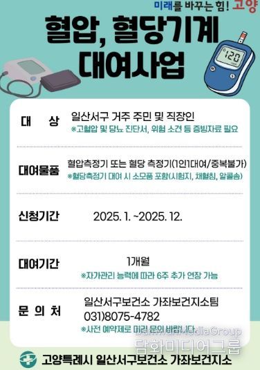 시민행정신문 기자 | 고양특례시 일산서구보건소 가좌보건지소는 일산서구 주민들 중 고혈압, 당뇨 유질환자이거나 전 단계 소견을 받은 주민들을 대상으로 혈압·혈당계 대여사업을 진행한다고 밝혔다.