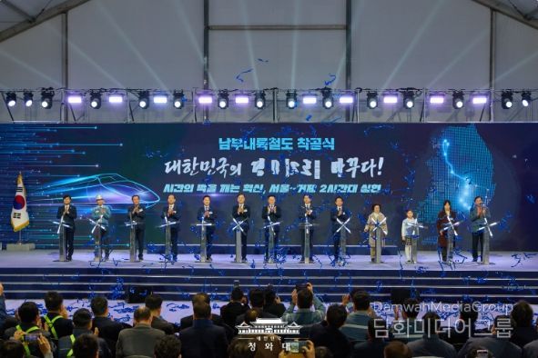 이 대통령은 이날 오전 남부내륙철도 착공식에서 기념사를 통해 "남부내륙철도가 마침내 착공한다. 이 뜻깊은 착공식을 온 국민과 함께 진심으로 축하드린다"며 이 같이 밝혔다.